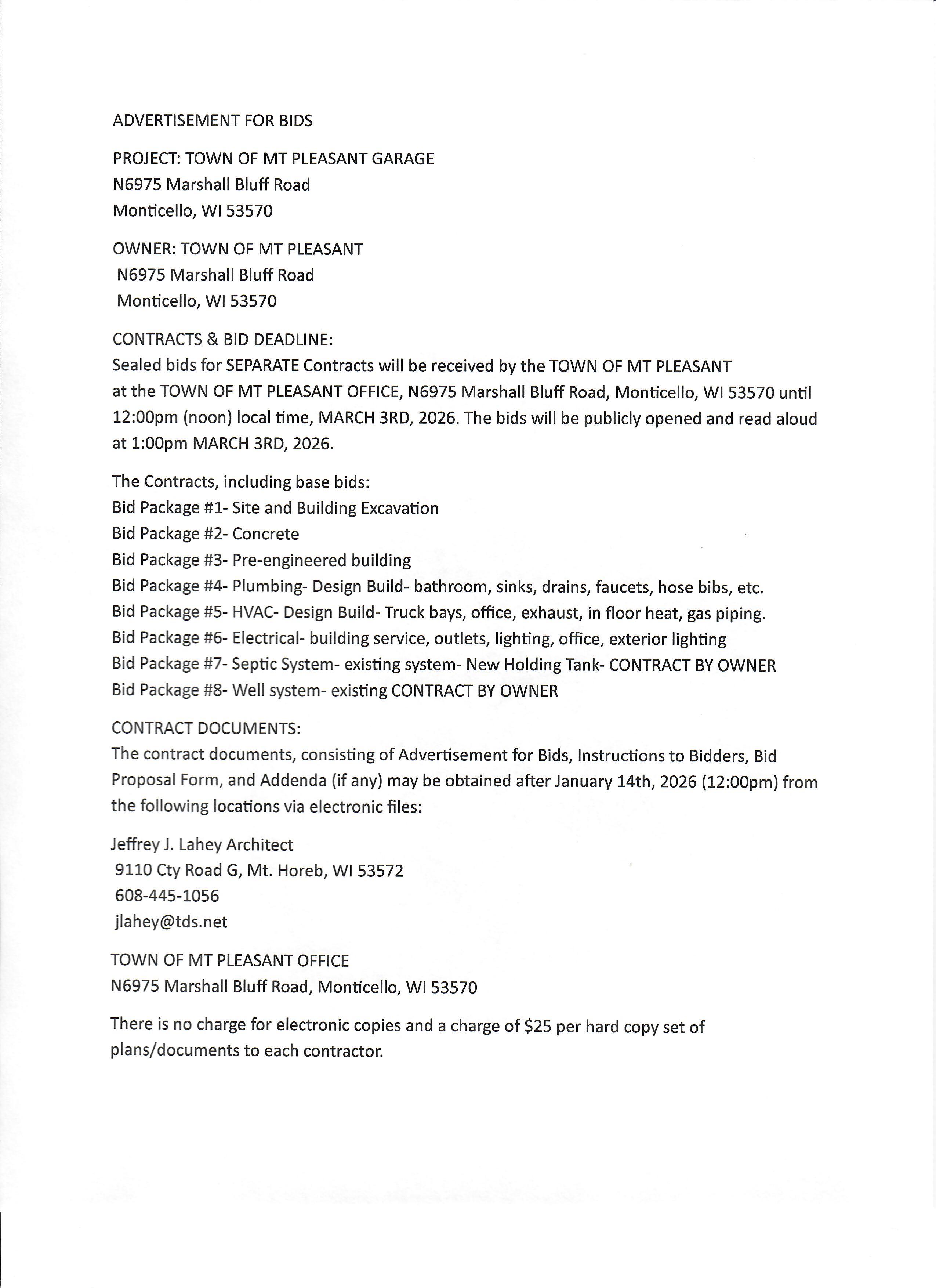 In April 2025, the Town of Mount Pleasant purchased 5 acres and a building on Marshall Bluff Road. The building was formerly an Amish schoolhouse and will be remodeled to become the Town Hall. A new Town Garage will be built on the property in the future.